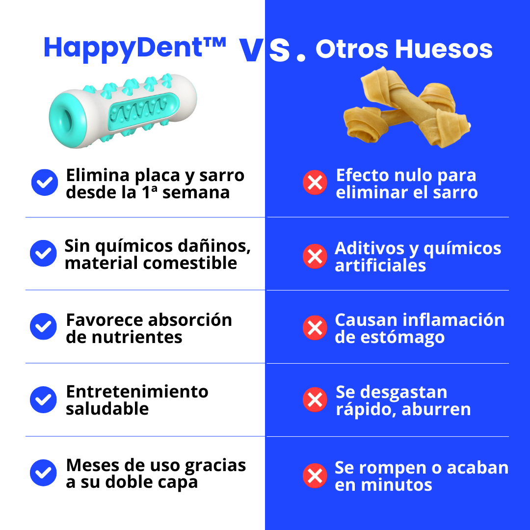 HappyDent™ 360º está hecho de material TPR de grado comestible, 100% seguro y libre de tóxicos. Si tu perro llegara a tragar algún trocito, lo expulsa de forma natural sin ningún problema.
